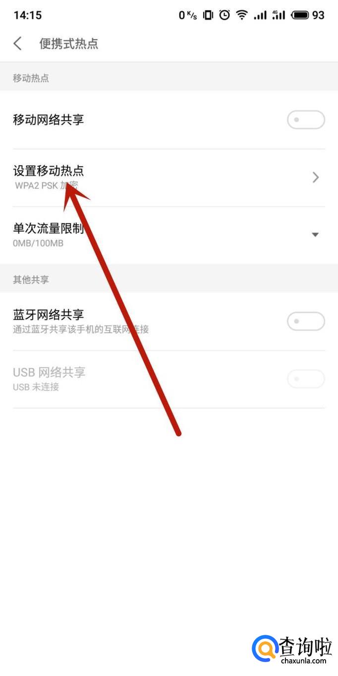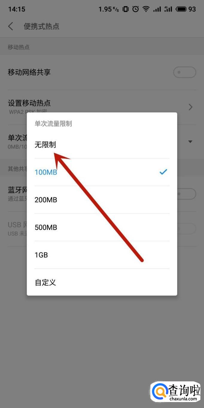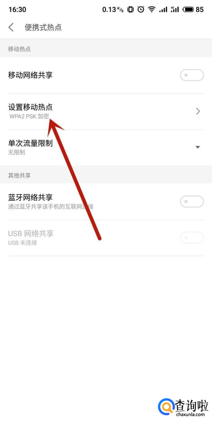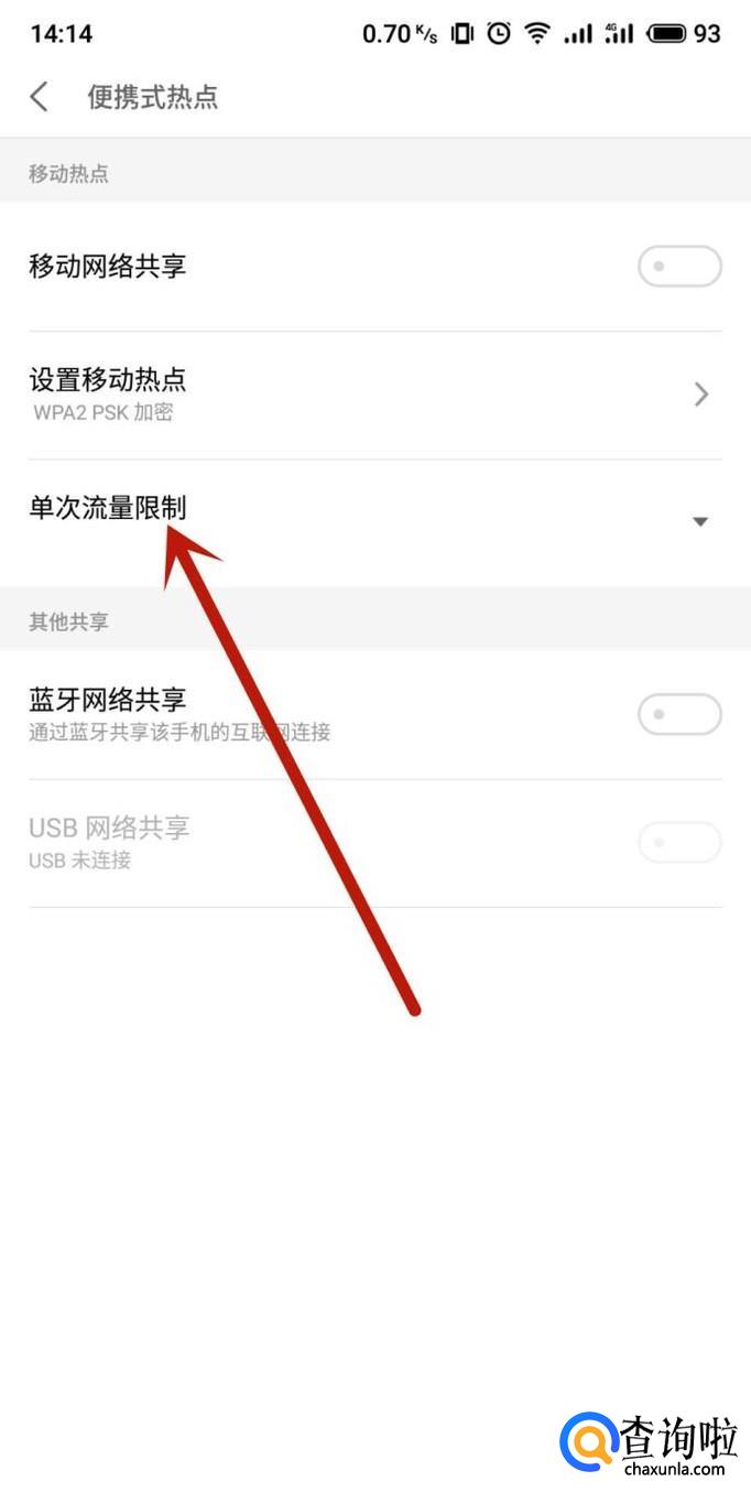 在“设置移动热点”页面选择“单次流量限制”,如图所示。