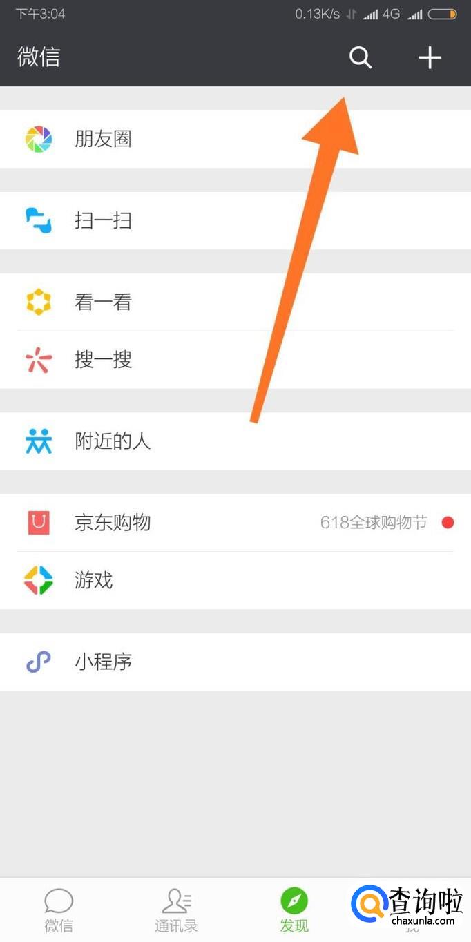 首先进入微信“发现”页面,点击界面右上方的搜索图标。
