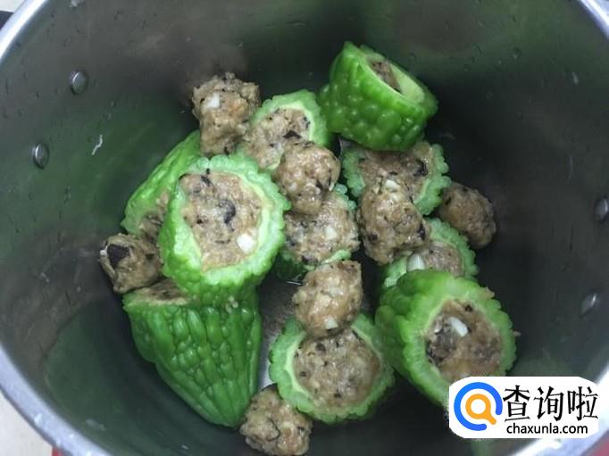 把拌匀的肉末填入苦瓜,放入锅中,倒入适量水