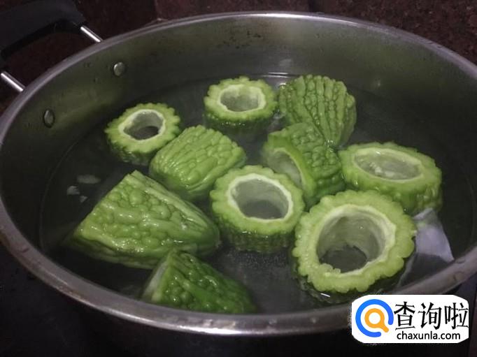 苦瓜洗干净切成段,去掉苦瓜中的囊之后,锅中倒入适量水,加入一点点盐,水开放入苦瓜焯水一会捞起