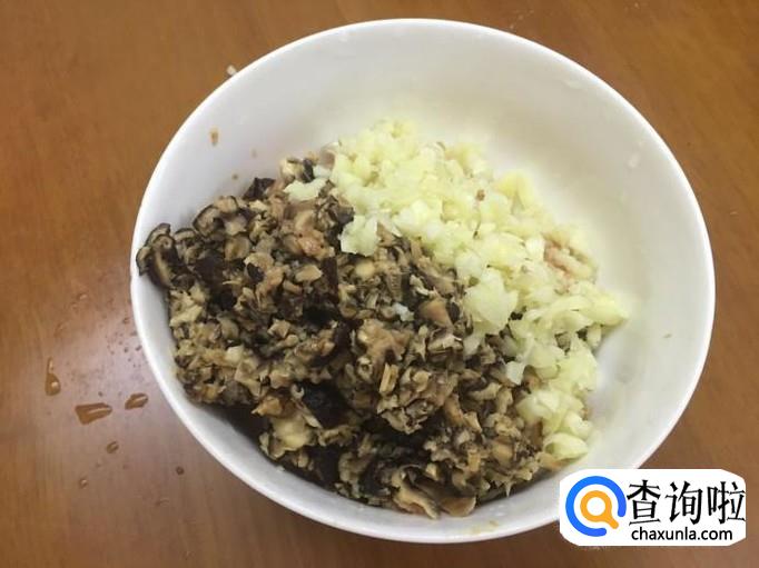 香菇放入料理机打成丁,倒入猪肉,蒜头去皮后切成末放入猪肉拌匀备用