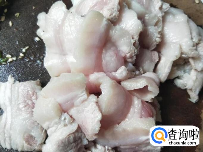 等到水煮沸之后,就能把五花肉倒出来放在篮子里面,加上清水冲洗干净,然后再切成一片一片的,最好切薄点,不要太厚了。
