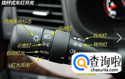 拨杆式车灯开关,从左至右来看,最左边的是灯组开关/灯光系统标识,然后第二排从上到下是近光灯、示宽灯、自动灯光、灯光关闭四个标识。而在最右边的分别为远光灯、转向灯、前后雾灯及雾灯关闭标识。