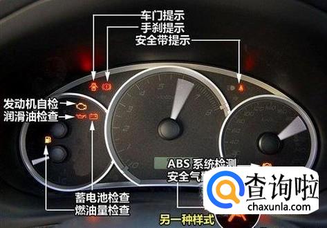 首先说一下仪表盘上的车灯标识,从图中可以看出,仪表盘上的车灯标识有:车门提示、手刹提示、安全带提示、发动机自检、润滑油情况检查、ABS系统检查、安全气囊检查、蓄电池提示以及燃油量提示。车灯的每个标识都很重要,一定要注意车灯提示情况,注意行车安全!