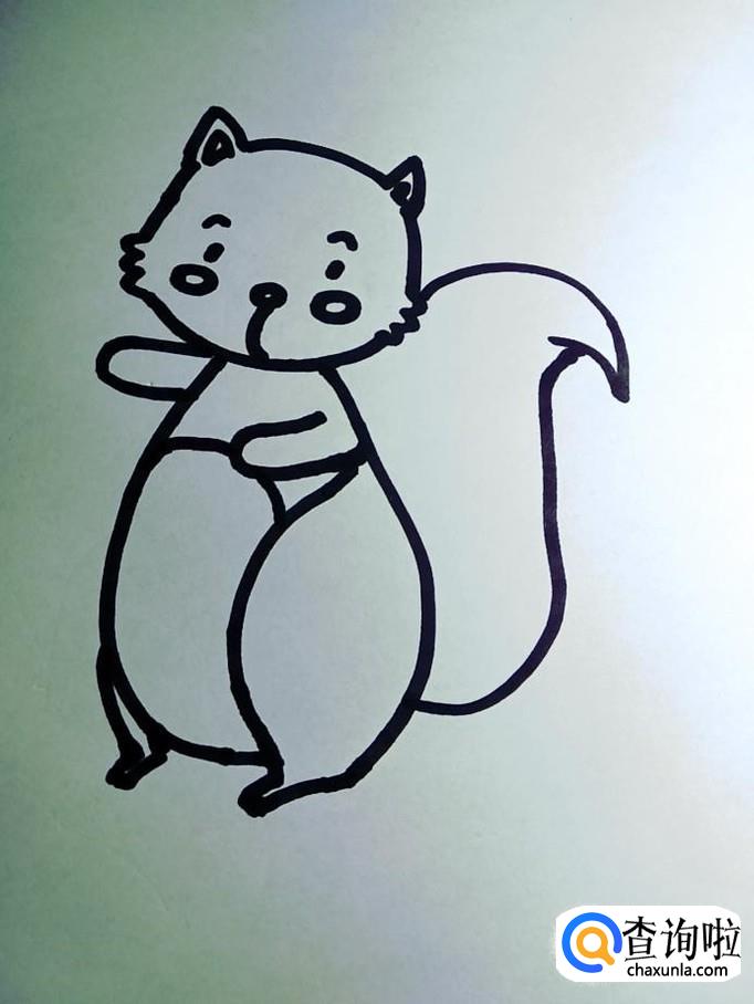 “松鼠的尾巴好像一把伞。”所以松鼠的尾巴画的蓬松一些,尾巴左上部和右下部都向身体的右侧伸展一下,最后在尾巴右上侧收拢。那么,可爱的松鼠就完成了!