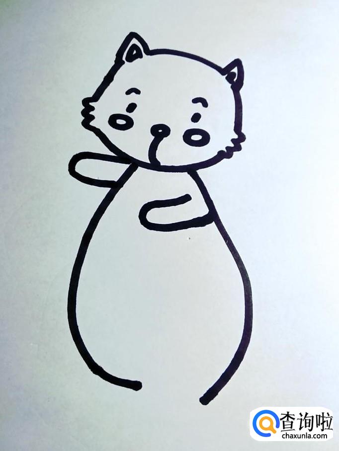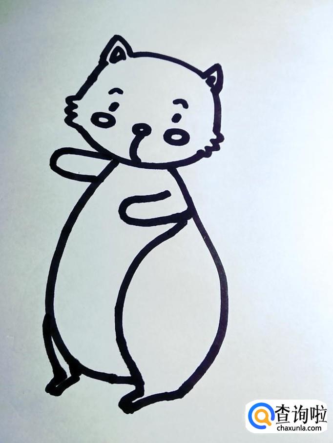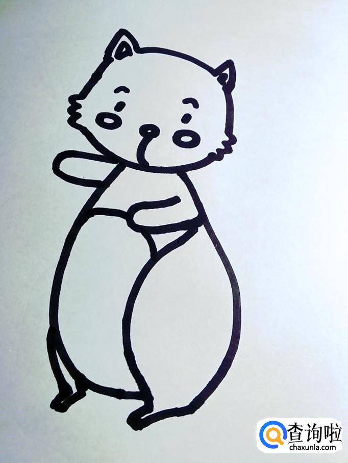 画出小松鼠的肚子。小松鼠的肚子呈倒芒果形,脖颈位置细,靠近腿部位置粗。在左右两侧用平滑流畅的线条画出,下端要画松鼠的腿,所以不要画闭合。