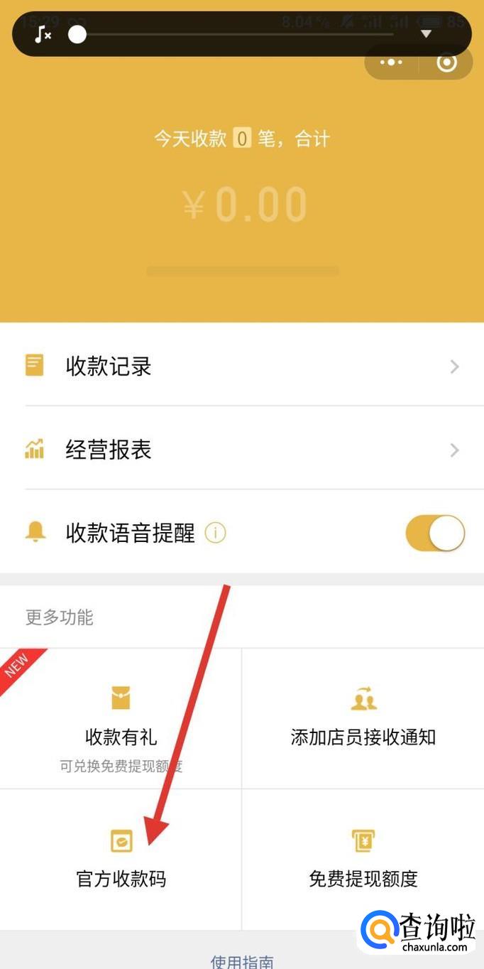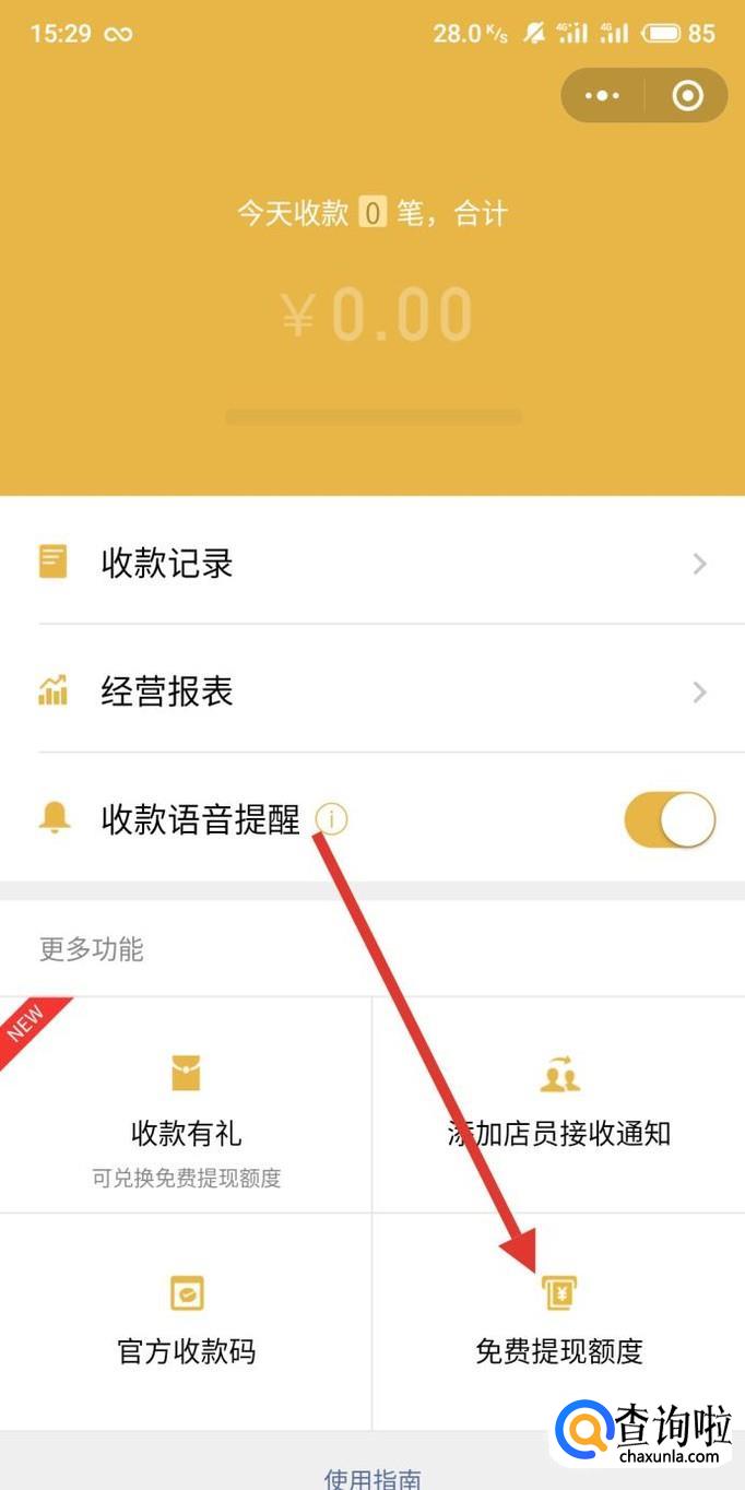 收到收款码之后,用二维码进行收付款,进入到收款小账本页面,点击“免费提现额度”,如图所示。