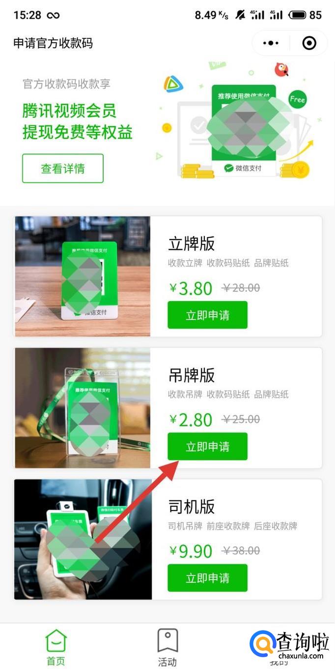 进入之后,选择一款收款码,点击“立即申请”,如图所示。
