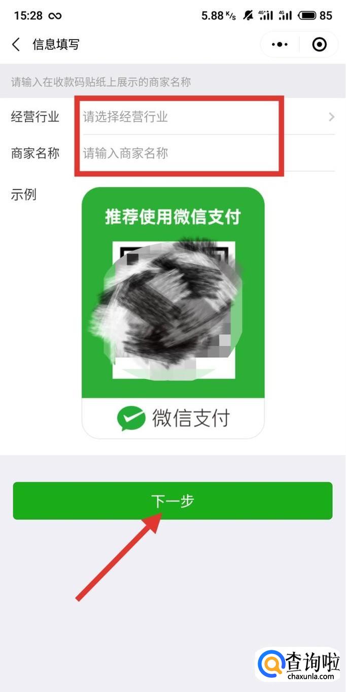 进入之后,输入经营行业和商家名称,点击“下一步”,如图所示。