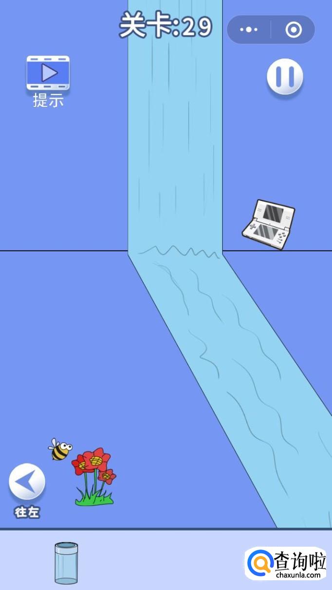 接着,我们往右滑动,来到第3个房间,看到有花、蜜蜂、游戏机,但是有条河挡着我们拿不到游戏机。