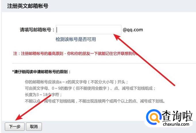 进入页面后,输入一个自己喜欢的英文账号,点击下一步按钮。