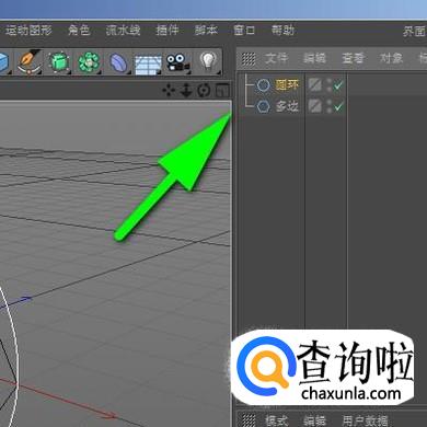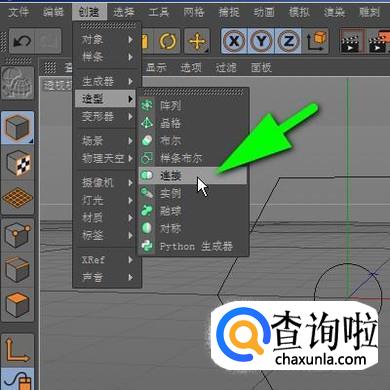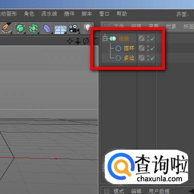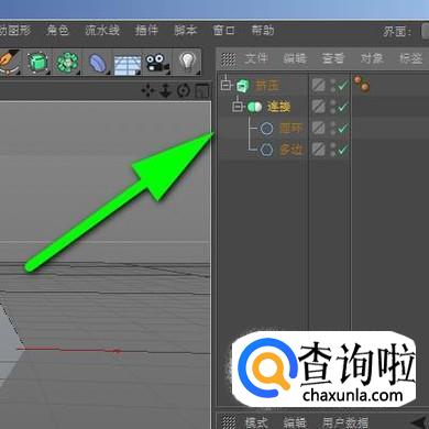 接下来,再在界面上方的菜单栏中依次点击:创建,造型,连接;创建一个连接对象。选中多边对象与圆环对象,并把这两个对象拖入到连接对象的子级中。