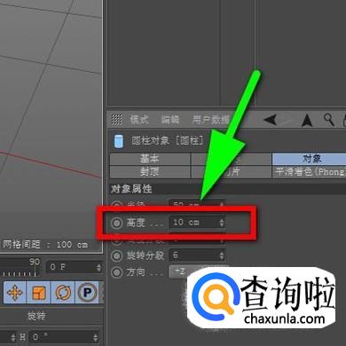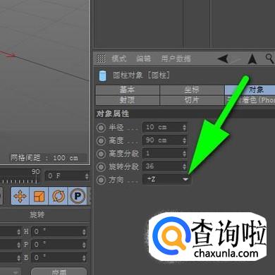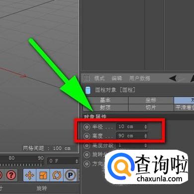 再来创建一个圆柱体;圆柱体的位置不要动哦,保持默认的位置。我们再看圆柱属性这里。把“半径”数值修改为10cm;把“高度”数值修改为90cm;再把“方向”修改为+Z