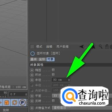 选中圆环对象,再看圆环对象的属性这里,把半径数值修改为50cm;看视图这里,圆环位于六边的中间。 - 010