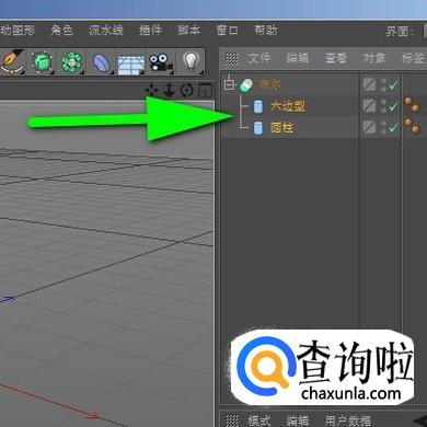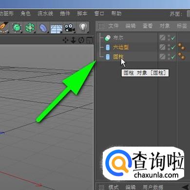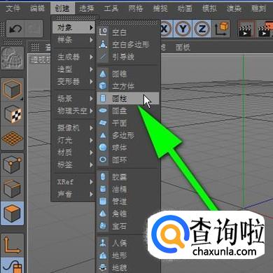 在软件界面上方的菜单栏中点击“创建”,在弹出的列表中再点“对象”,右边弹出对象列表,点击“圆柱”创建一个圆柱体。