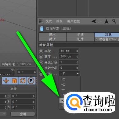 再看界面右下方这里,这里已显示了圆柱的属性,着重关注“旋转分段”这里,当前旋转分段数值为36,我们把数值修改为6。紧接着,再看下面的“方向”这里,把当前的+Y,修改为+Z;那么,视图上的模型的六边面就对着我们了。