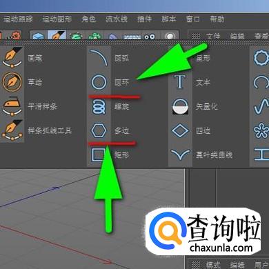 在界面上方的工具栏中,鼠标长点画笔工具的这个图标,在弹出的样条面板中,分别选中“多边”和“圆环”;创建多边对象与圆环对象。