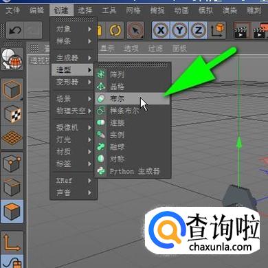 看视图这里,现在的状态下,圆柱在六边型的中间位置穿过。接下来,就到“布尔”出场了。在菜单栏上依次点:创建,造型,布尔;创建布尔对象。