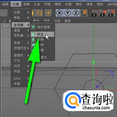 再在界面上方的菜单栏中依次点击:创建,生成器,挤压;创建一个挤压对象。再把连接对象拖入到挤压子级中。