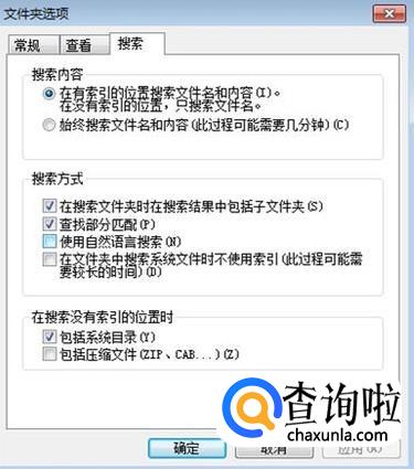 在文件夹选项中选择搜索选项,去掉使用自然语言搜索前面的对钩,然后点击确定。这样就可以解决问题了。