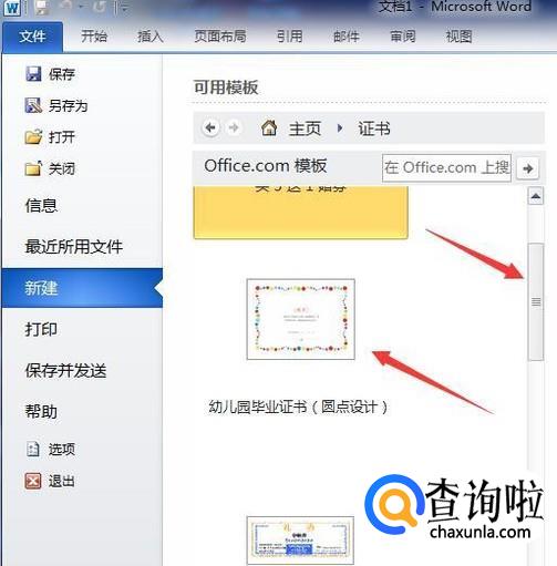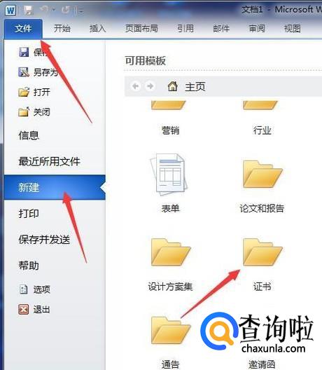 首先,打开Word2010,点击文件菜单,点击新建,在右侧的模版中双击证书文件夹。