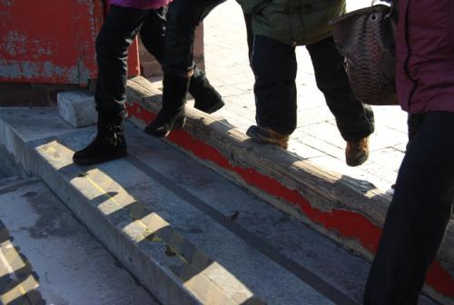 宫门关闭是依靠门槛为门扇固定的,因此被锯的门槛在两端均补装了榫头,关门时摆回原处,倒也不影响使用。这些经过改装的门槛,至今在故宫仍随处可见。