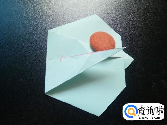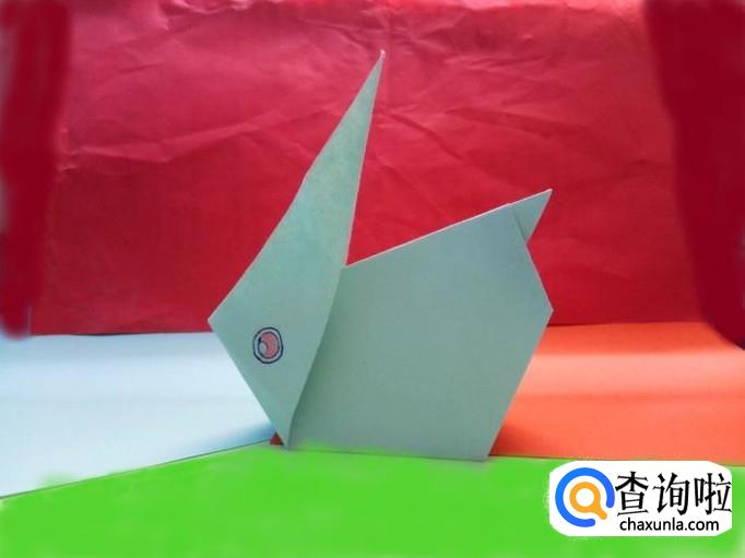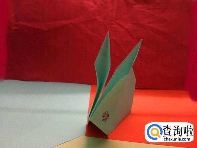 把折纸沿剪开的中线向内对折,最后把两只兔子耳朵向上拉,调整好角度,基本上就完成了。