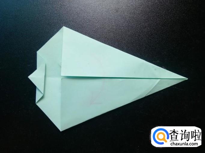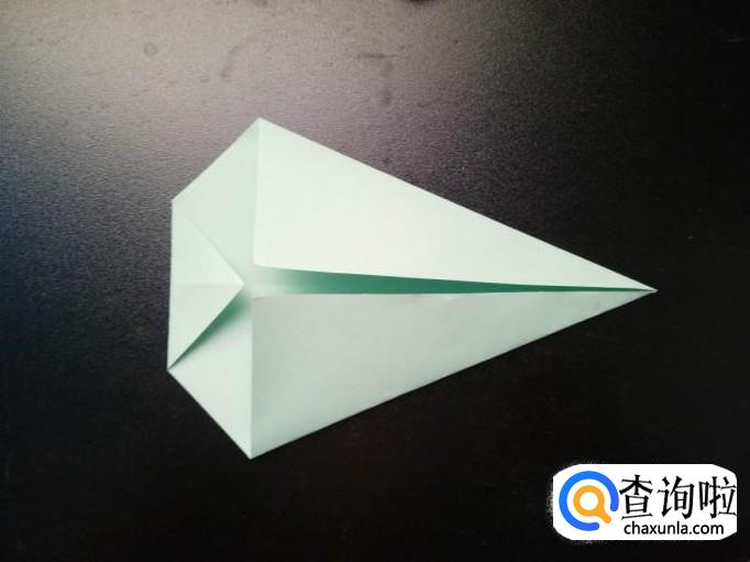 把整个折纸翻过来,如图所示,将右边长的三角形往内对折,尖端不超过左边的那条线。