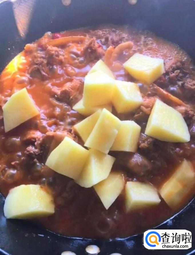 然后我们加入土豆块,炖至软烂,再放入青椒,翻炒均匀