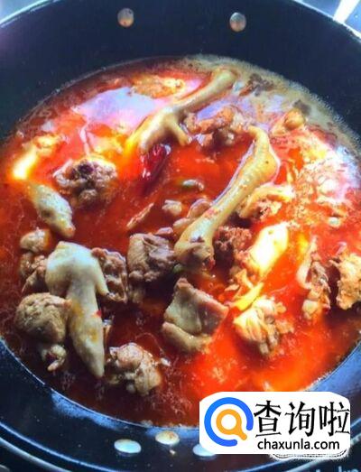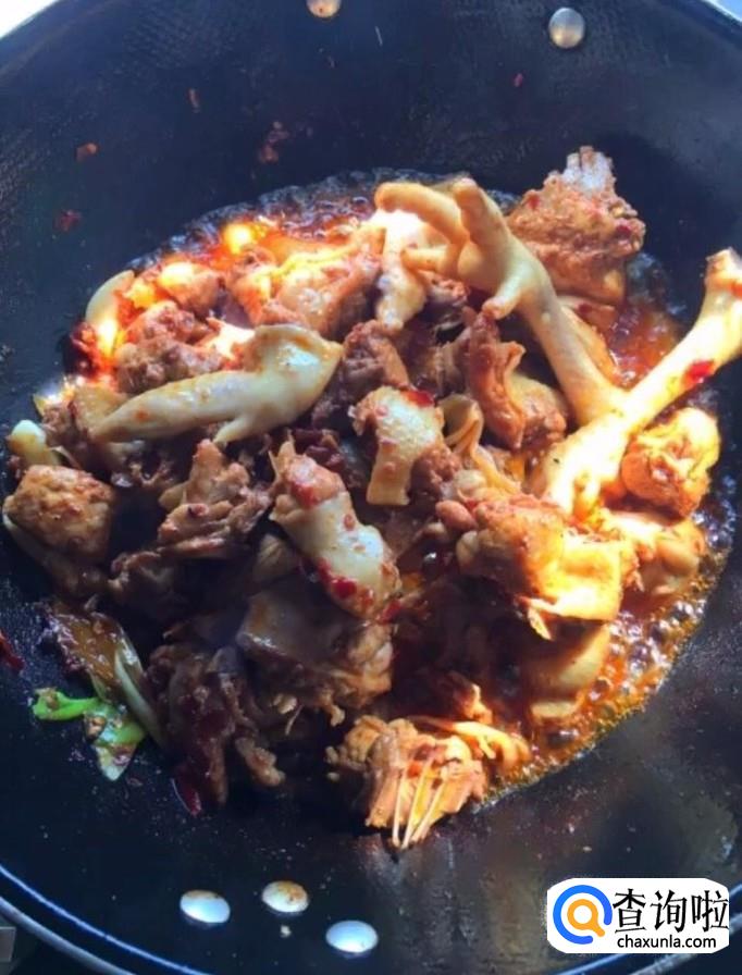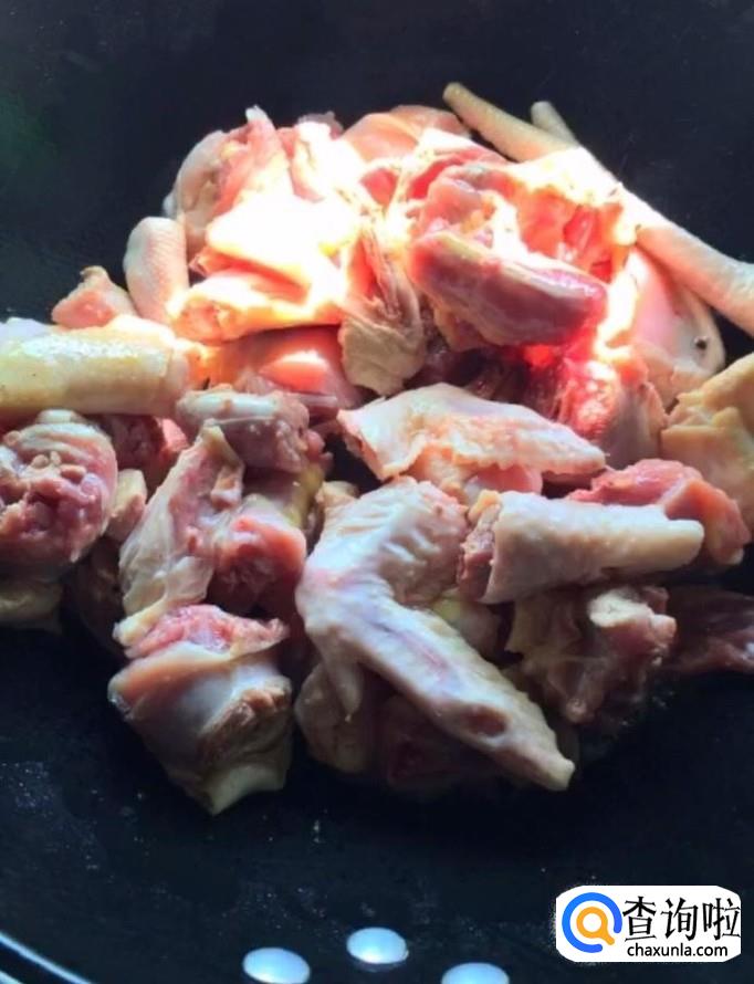 接着我们把花椒捞出来扔掉,放入切好的鸡块,翻炒5分钟左右