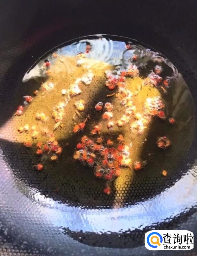 然后我们在锅中放入少许油,油热放入花椒,爆香