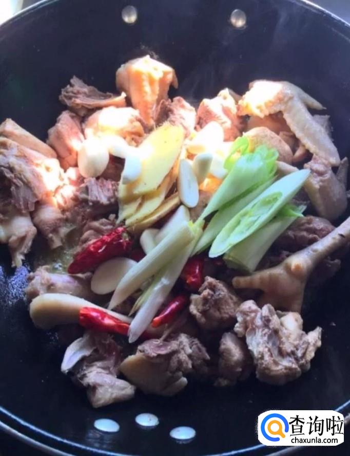 然后我们加入姜片,蒜,干辣椒,葱段,翻炒一下,倒入适量的料酒,老抽,大盘鸡料,把它翻炒均匀