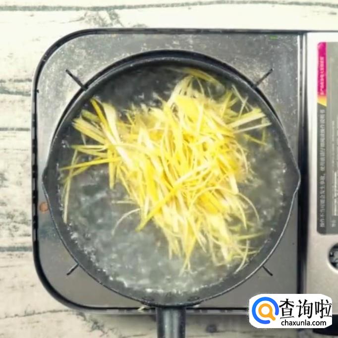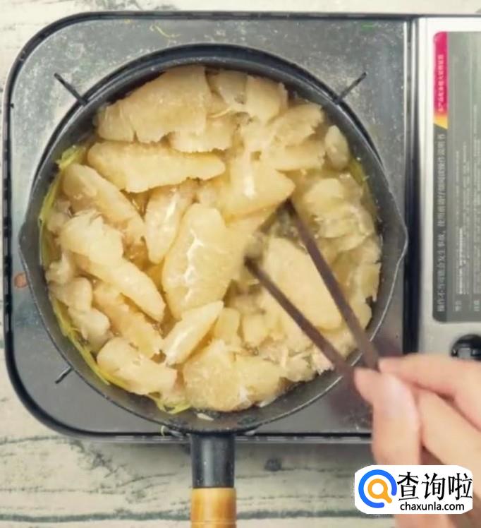 将橘子皮放入事先准备好的锅中煮,直到柚子皮煮软