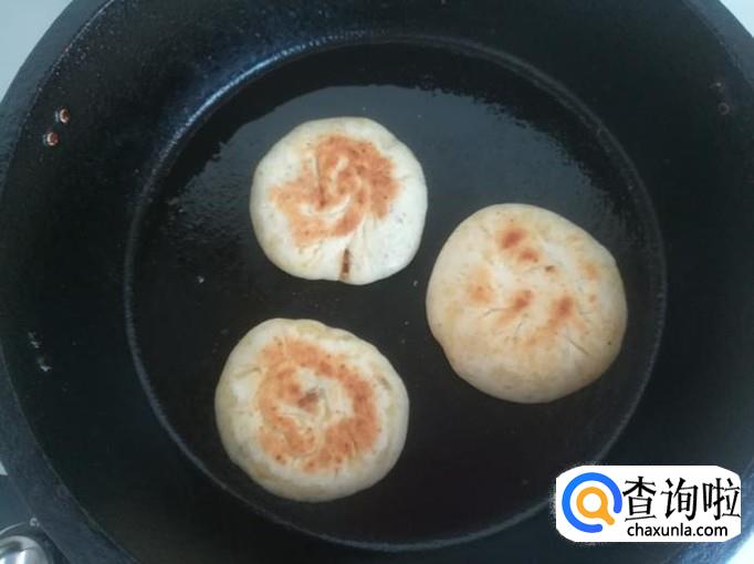 等面饼的一面烤烙的鼓起来,再翻面烤烙另一面,直至把面饼烤熟。