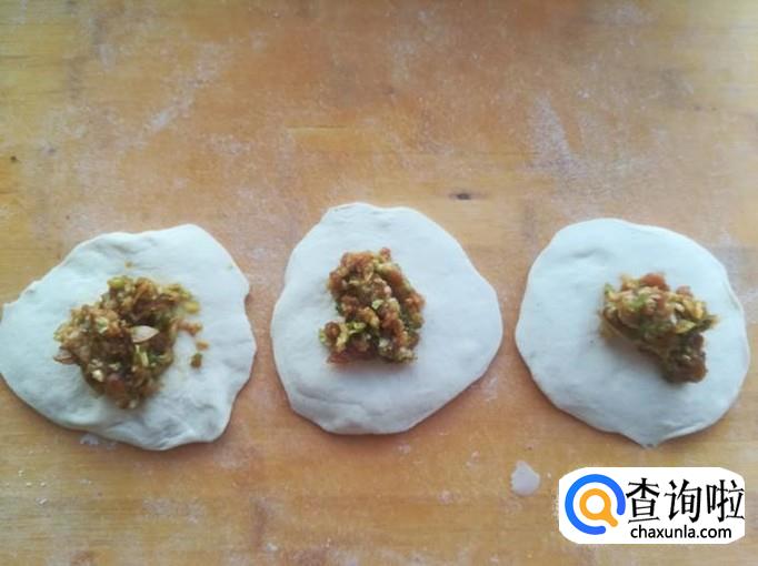 把揉好的面团揪成若干个小剂子,擀成中间厚,周边薄的圆形面皮,再给面皮里舀一勺肉馅。