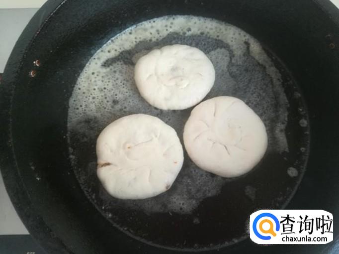 取一个平锅,给锅底滑一层胡油,把面饼生坯放入平锅里,调小火烤烙。