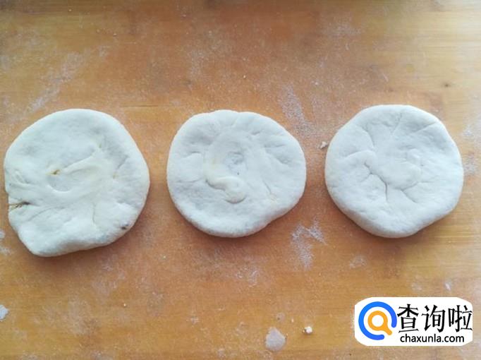 把肉馅包住,擀成面饼,制成面饼生坯。