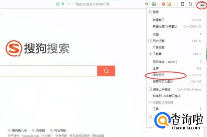 随便打开浏览器的页面,然后点击右上方的【打开菜单】按钮,在弹出的下拉菜单中选择【保存网页】,如下图所示: