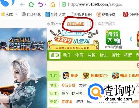 打开浏览器,找到4399小游戏网页打开,在主界面左上角有个“保存到桌面”,点一下。
