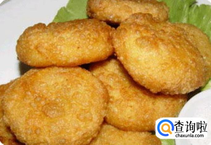 将面饼包上白砂糖,再压成饼状。入油锅进行炸制,炸到金黄即可。