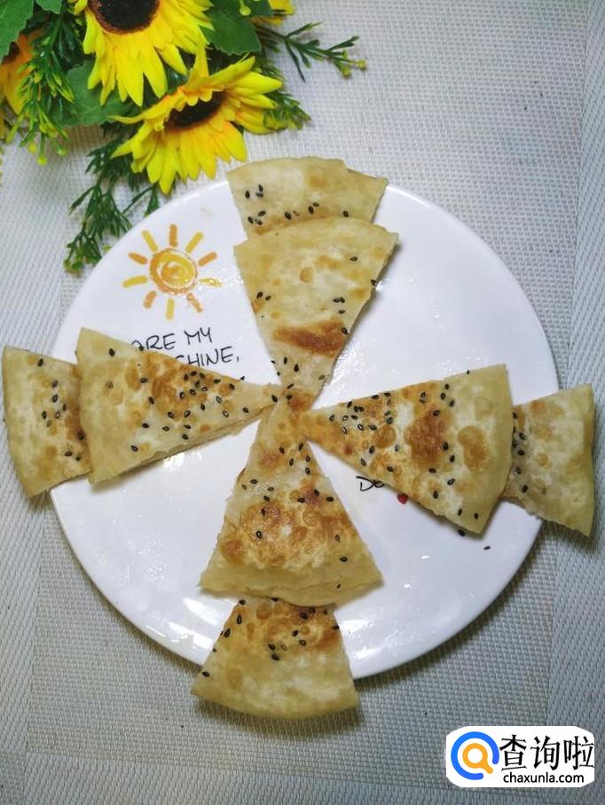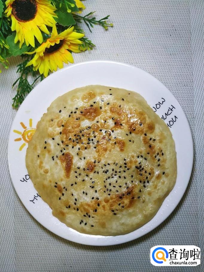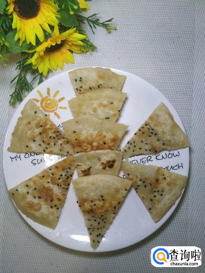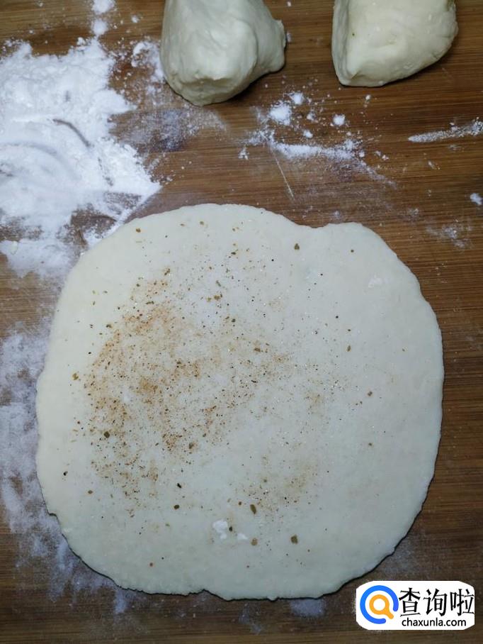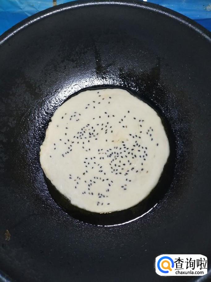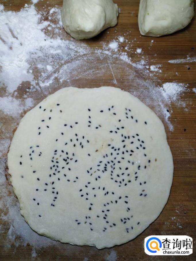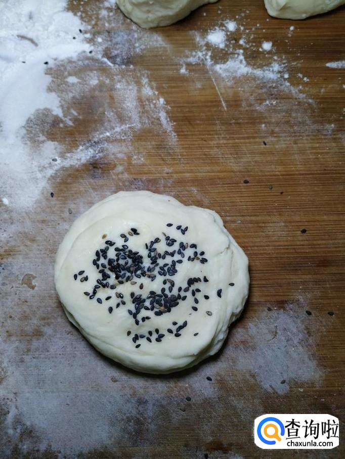 用手按扁之后,上面加一些黑芝麻,然后用擀面杖擀开,擀成圆形。