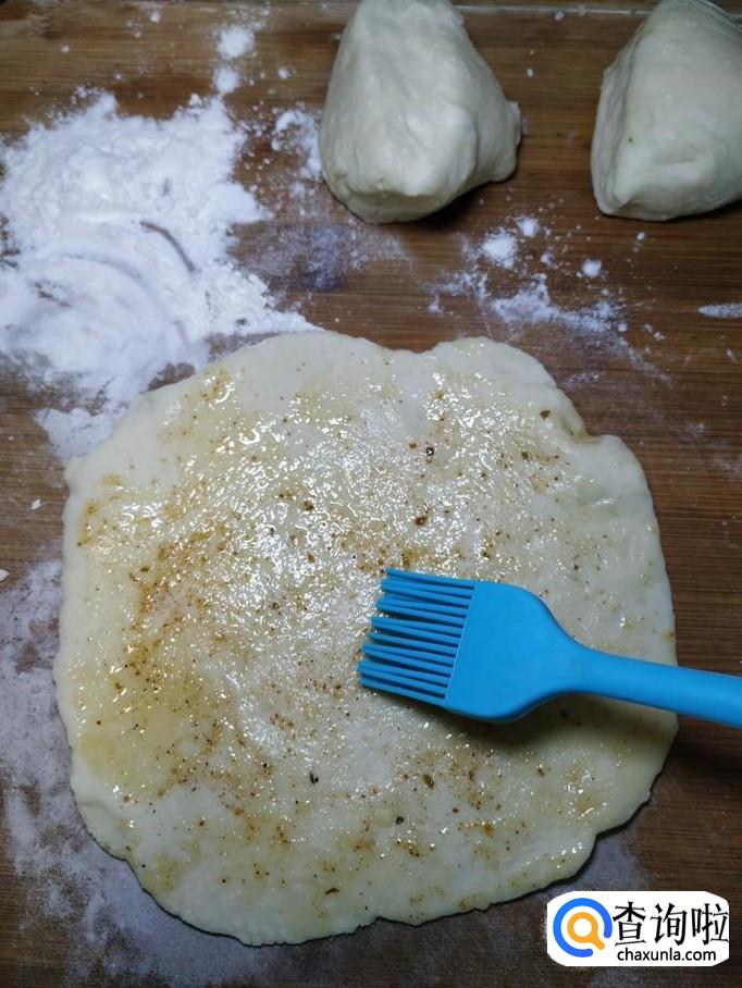 放入适量盐和五香粉,用手搓开,然后用刷子刷一层熟油,如图所示。