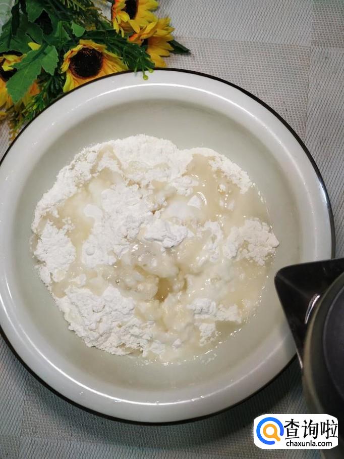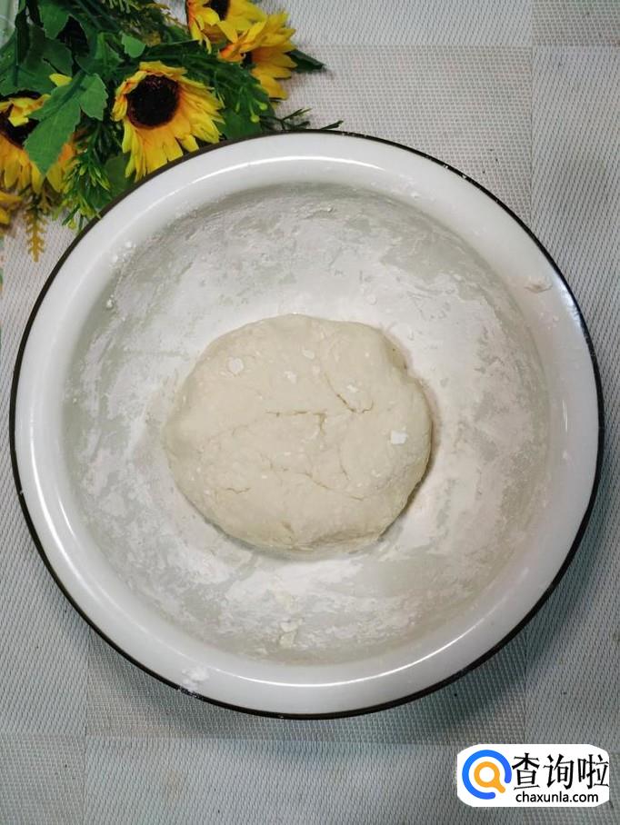 碗中放入适量面粉,然后加入开水,用筷子快速搅拌,小贴士:水要一点一点的倒进去,一边倒,一边用筷子搅拌成絮状。等到不烫手的时候,用手揉成光滑的面团,醒十分钟左右。