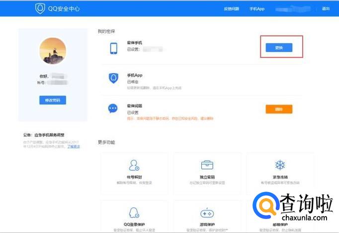 我们可以去选择更改密保手机,将密保手机设置为新手机号。我们打开QQ安全中心首页,登陆上自己的QQ号就可以看到密保手机选择,点击更改即可。如图