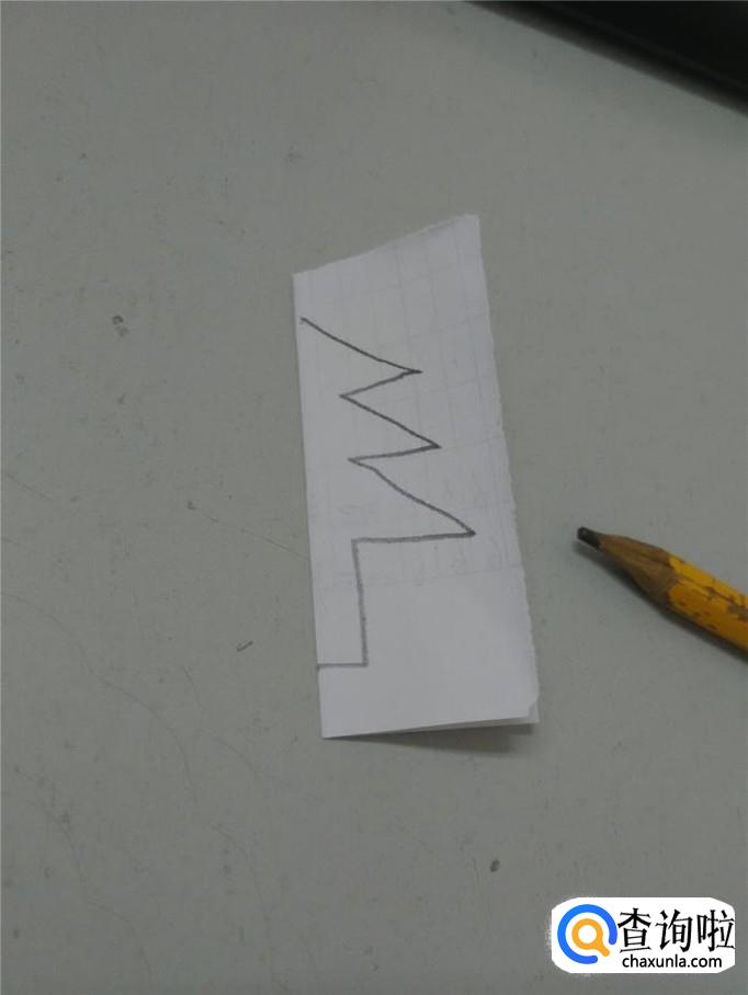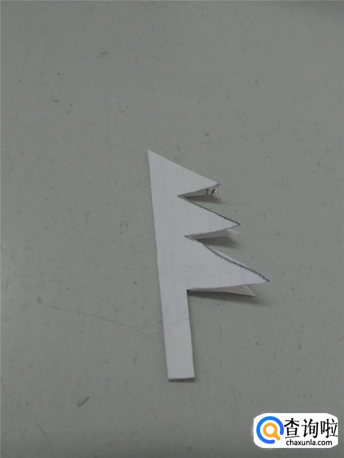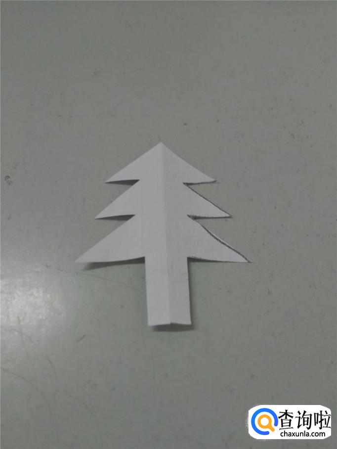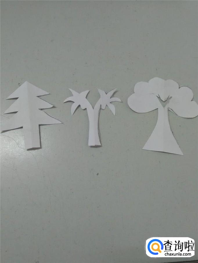 先来剪一棵松树,松树最好剪,先把纸向右折叠,用笔在纸上画一个三角形,在三角形的下面再画两个梯形,最下面画一个长方形。用剪刀把画好的松树剪下来,打开纸,就是一棵松树。