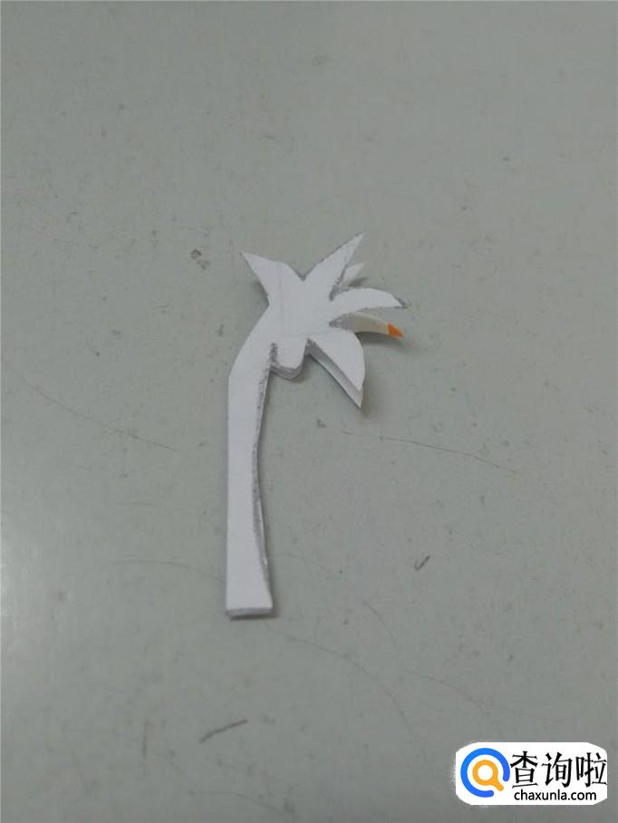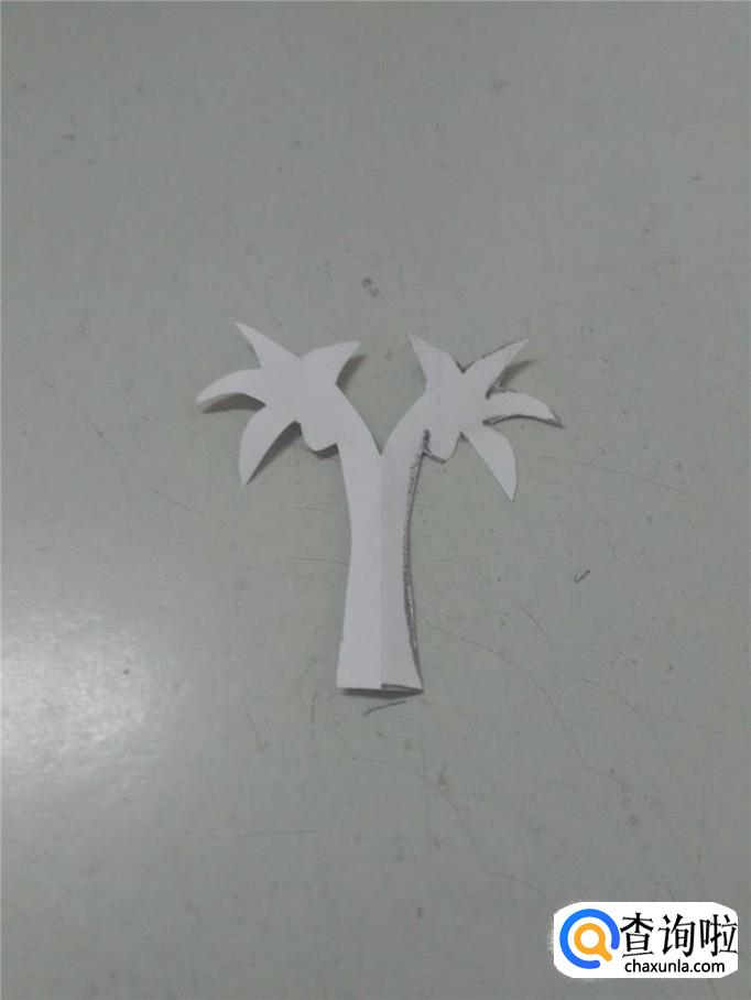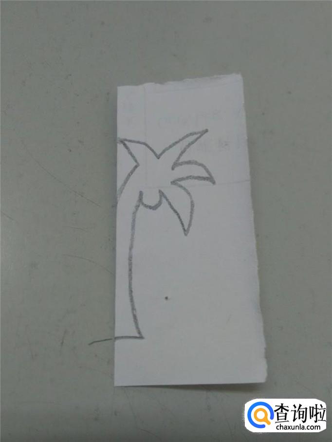再来剪椰子树,也是先把纸向右对折,用笔在左边画上几个锯齿形状,当作树叶,树叶的下面画长长的树干,然后用剪刀沿着线剪下来,把纸打开,就是一棵椰子树。