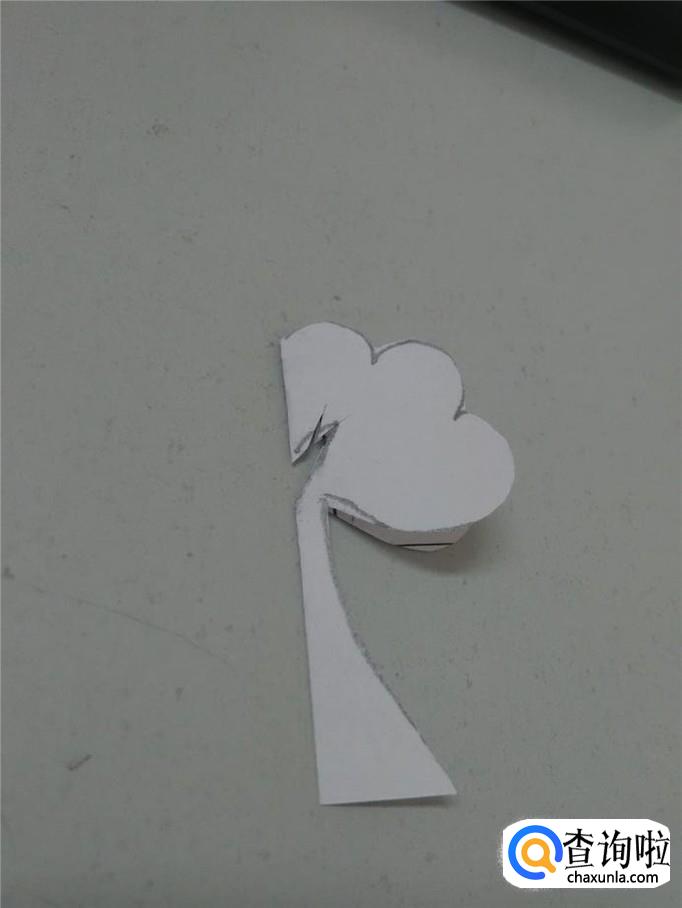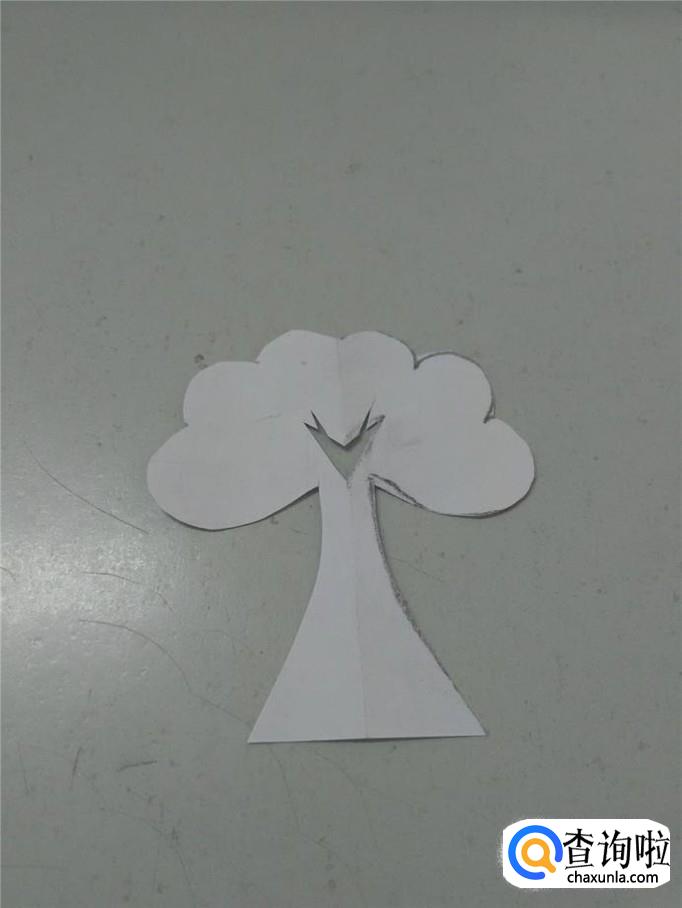 再来剪大槐树,也是先把纸向右对折,槐树的树冠比较大,所以先画几个圆弧形,表示树冠,再画一个弯弯的三角形,表示树干,在树冠中间再画一个三角形,表示树杈,用剪刀先剪右面的轮廓线,再把中间的树杈剪掉,打开纸,一棵大槐树就剪好了。