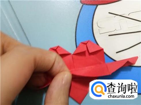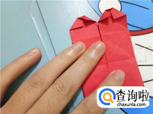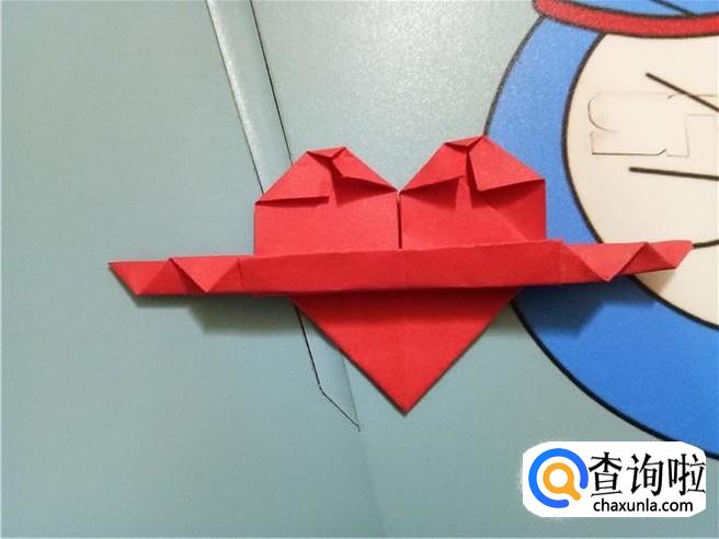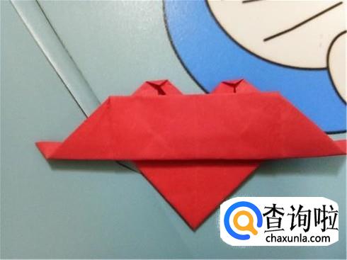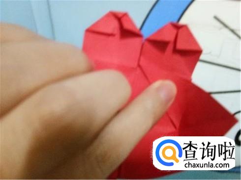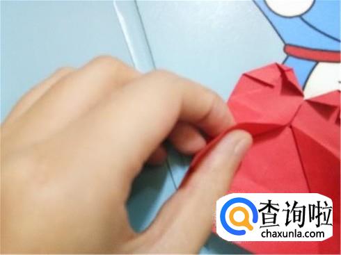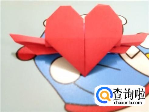 最后,将折的后面的两次的凸出部分轻轻的向下拉一点,但是它们的对称点仍然在三次折叠的对称点。翻到另一面后就可以看见一个带“翅膀”的爱心了。