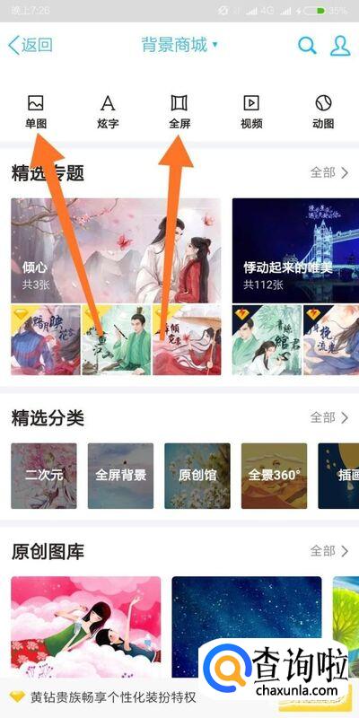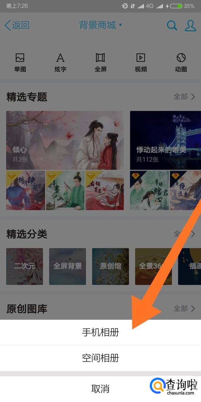 接下来就可以设置手机QQ空间的背景图片了,除了使用官方提供的图片,还可以点击“单图”和“全屏”选项,从手机相册选择图片作为空间背景图片。