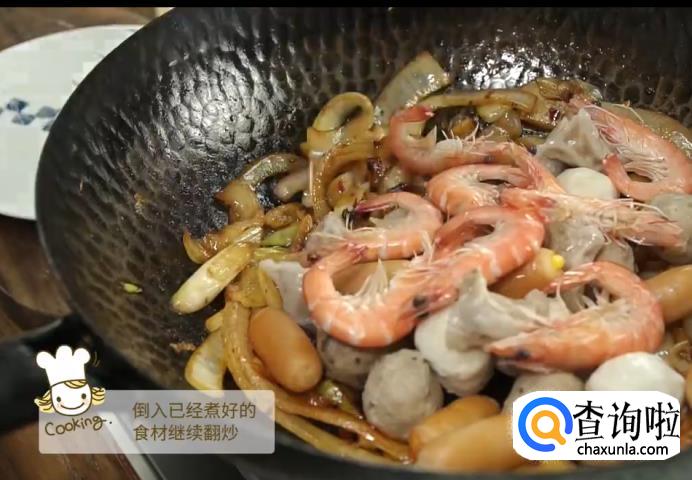 接着热油锅,炒香蒜末和洋葱之后放火锅料翻炒,倒入已经煮好的食材继续翻炒。